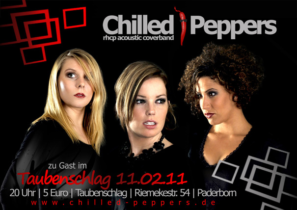 Kalt und heiß. Entspannt und kraftvoll. Und authentisch. Genau diese Stimmung ist die Spezialität der Chilled Peppers. Wie der Name schon sagt. Auf der Bühne stehen drei stimmgewaltige Frontfrauen (Amanda Porter, Anna Friebe, Lissy Ishag), die von einem Gitarristen (Sven Hemsley), einem Pedal-Steel-Guitar-Player (Andi Seifert), einem Bassmann (Michael Driesner) und einem Schlagwerker (Karsten Prior) begleitet werden. In dieser Besetzung wird den Songs der legendären Funk-Rocker ‚Red Hot Chili Peppers’ eine ganz neue Note gegeben. Ein wahrhaft außergewöhnliches Hörerlebnis. Die Musikanten freuen sich, im Rahmen ihrer Paderbornification World Tour in der sympathischen Eck-Kneipe „Taubenschlag“ im Riemeke-Viertel eine Kostprobe dieser akustischen Inspiration liefern zu können.